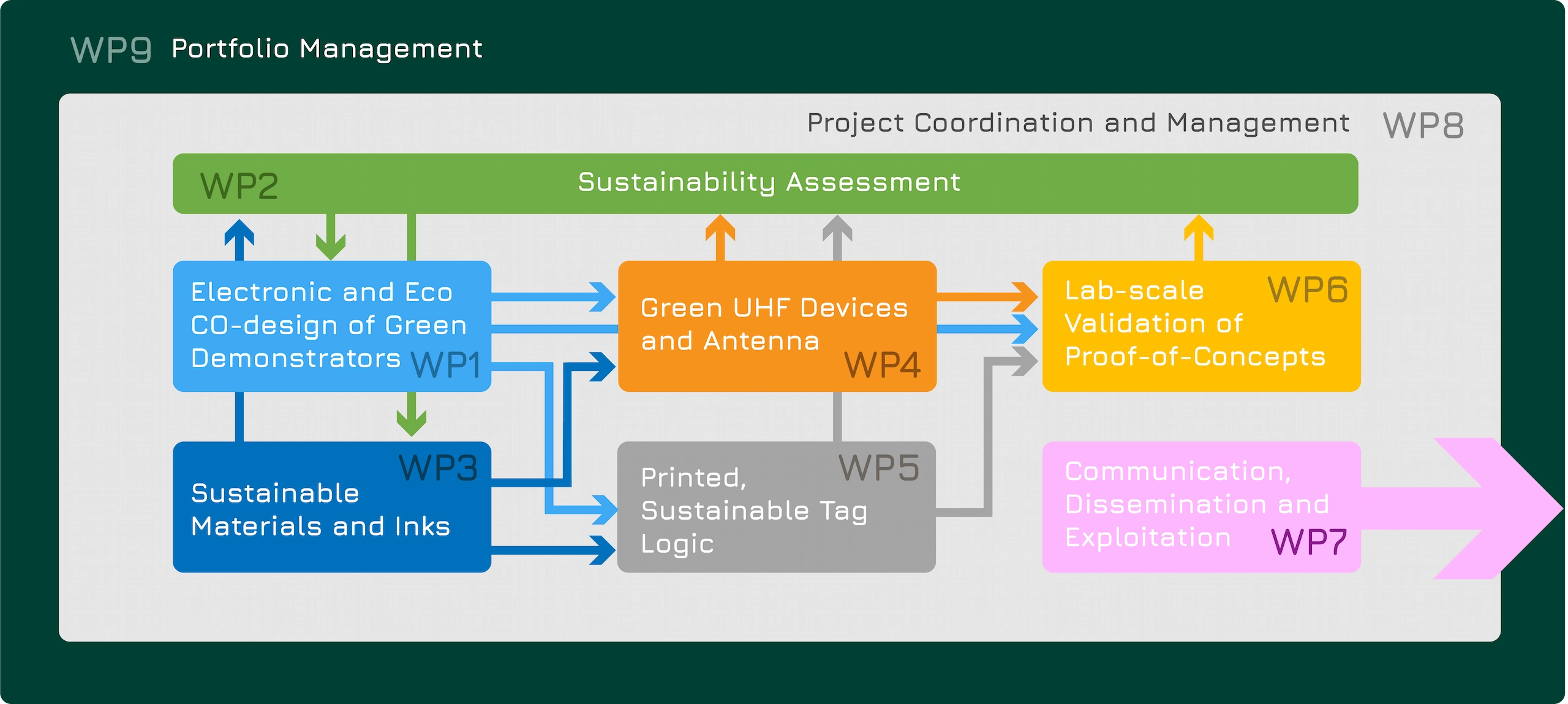 WP3 is dedicated to the synthesis of sustainable materials and inks, as well as to the introduction of sustainable substrates and dielectrics: it receives results on sustainability from WP2 and delivers materials to WP4&5, dedicated to components.