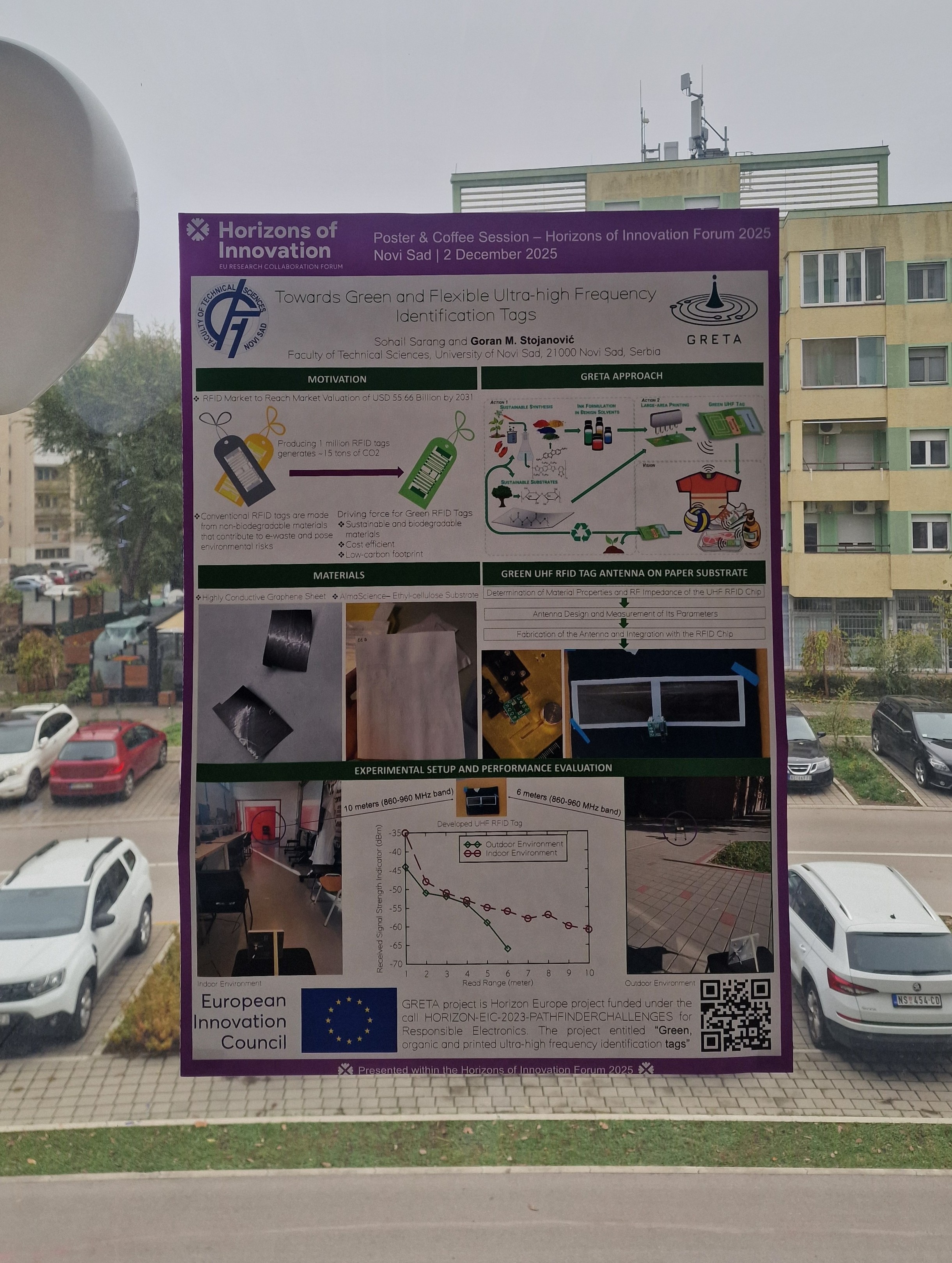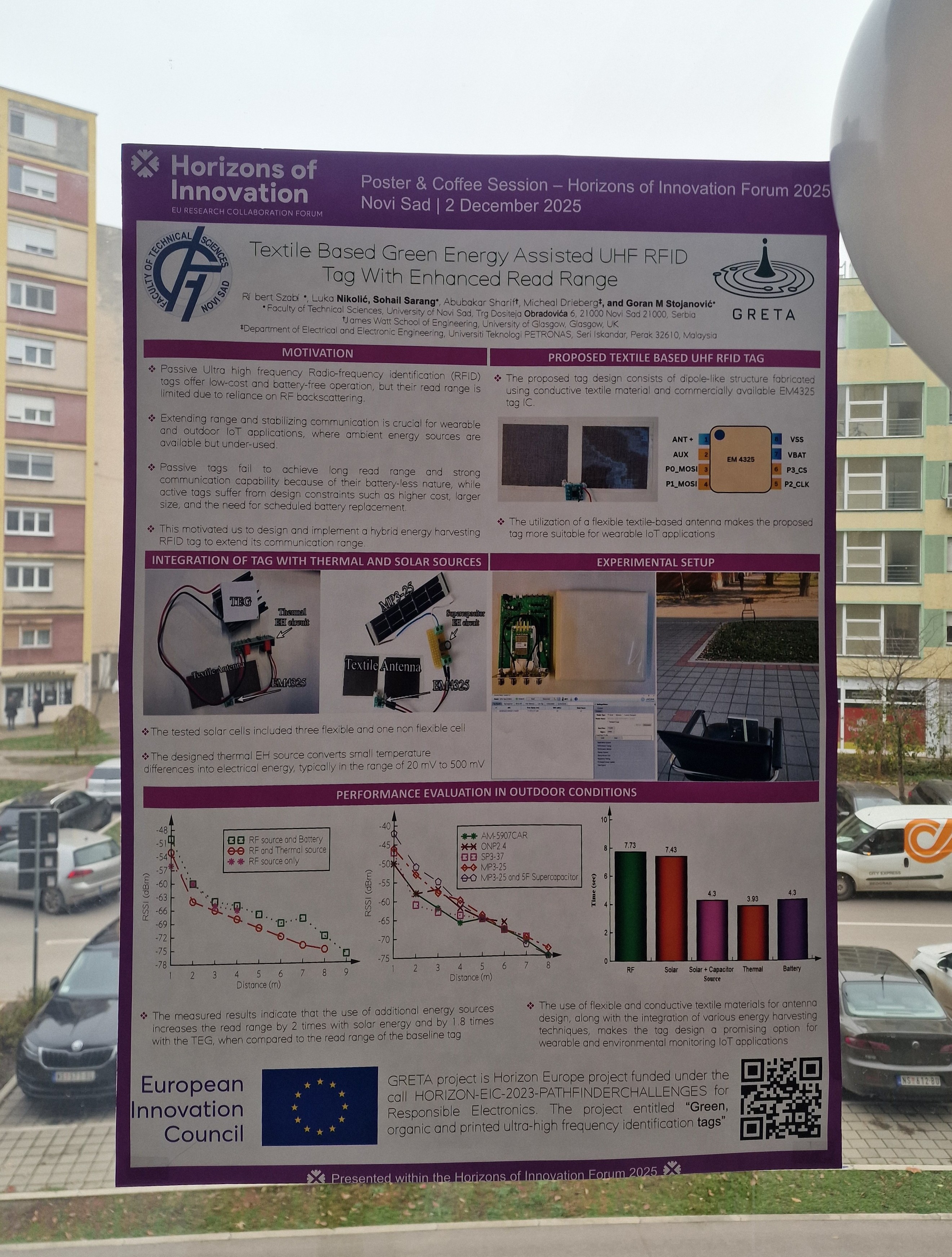 During the event, the GRETA project was highlighted through two poster presentations and an interactive session. The first poster, authored by Sohail Sarang and Goran Stojanović, was titled Towards Green and Flexible Ultra-High Frequency Identification Tags. The second poster, prepared by Robert Szabi, Luka Nikolić, Sohail Sarang, Abubakar Sharif, Michael Drieberg, and Goran Stojanović, presented Textile-Based Green Energy Assisted UHF RFID Tag with Enhanced Read Range