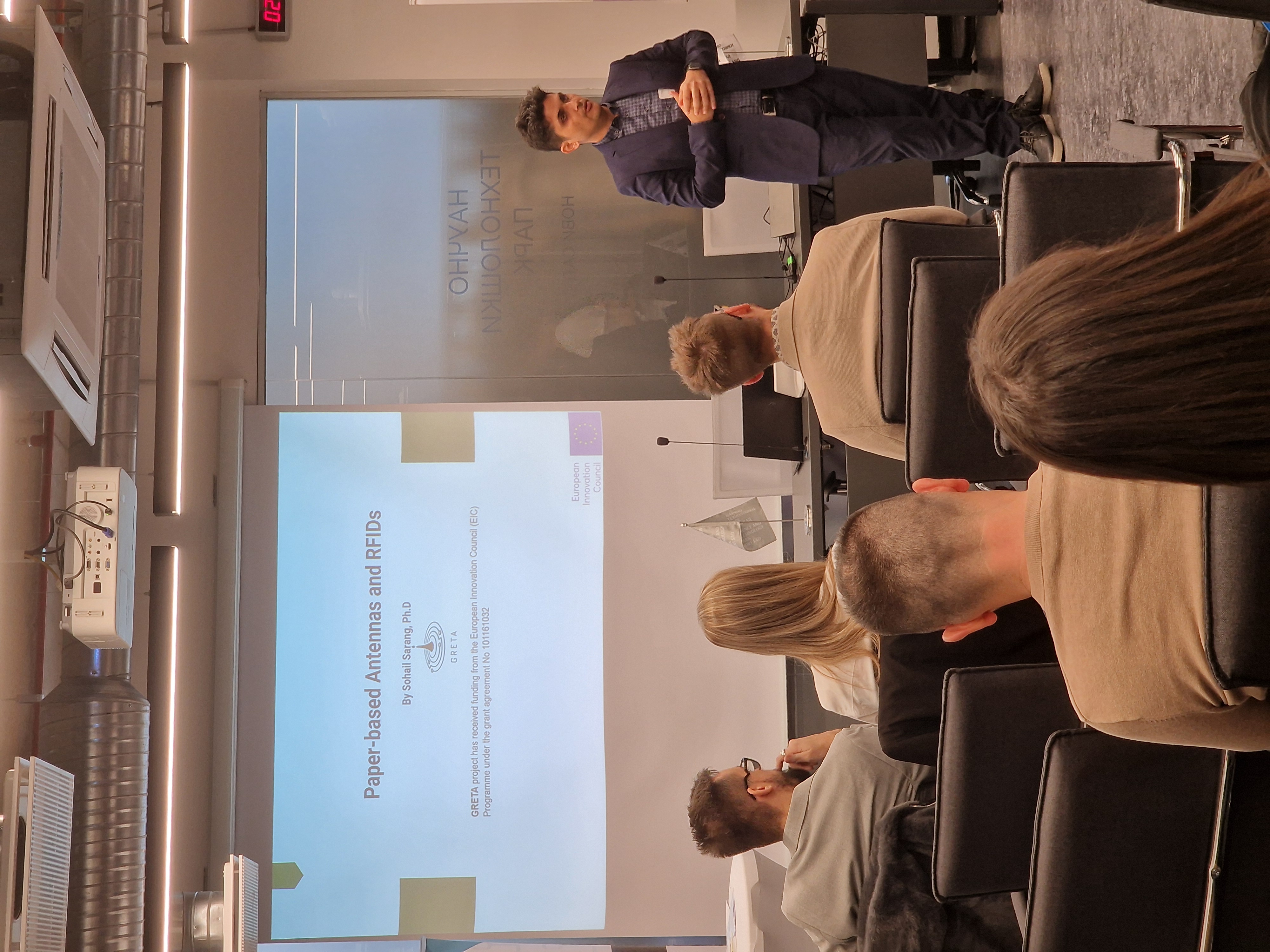 In addition to the posters, GRETA was featured in an interactive session led by Dr. Sohail Sarang, who presented Paper-Based Antennas and RFID Technologies. With over 30 participants in attendance, Dr. Sarang introduced the fundamentals of RFID technology, its market potential, and the principles behind antenna design and conventional RFID tag antennas. He also outlined the motivation and vision behind the GRETA project, showcased textile-based green energy assisted RFID tags, and discussed the project’s future direction.